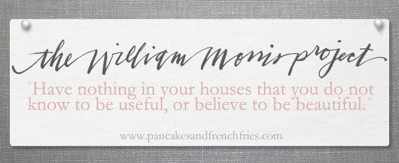 If you are following you know that I am trying to Organize and Simplify our home. We will downsize someday and right now our house is filled with stuff that we don't use or need anymore. I have been inspired by Tsh Oxenreider's book Organized Simplicity and Jules over at Pancakes and Frenchfries her William Morris Project. Check them out!